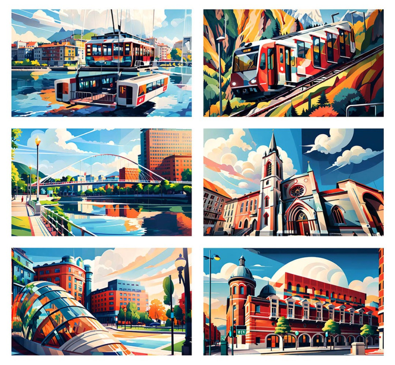 Diseño gráfico que refleja la interconexión de la vida en la ciudad mediante de forma creativa y con colores brillantes.